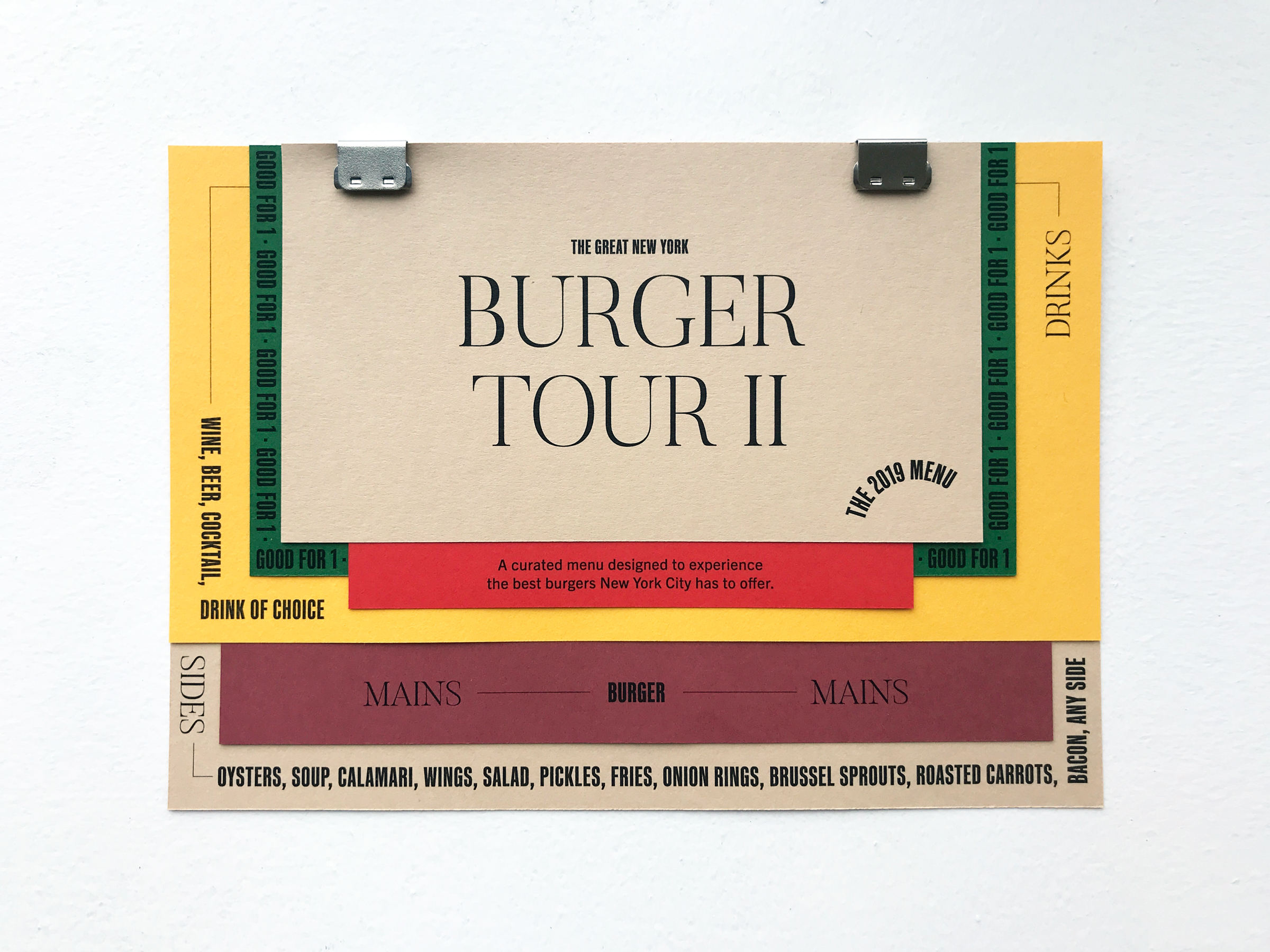 This is a curated menu designed to experience the best burgers New York City has to offer. I had created “The Great New York Burger Tour” as a gift to my partner a few years prior, where I researched and selected the best burgers in NYC to go and eat, my treat, and presented them in a creative format. This is a follow up to that gift, embarking on a new selection of restaurants and burgers.
